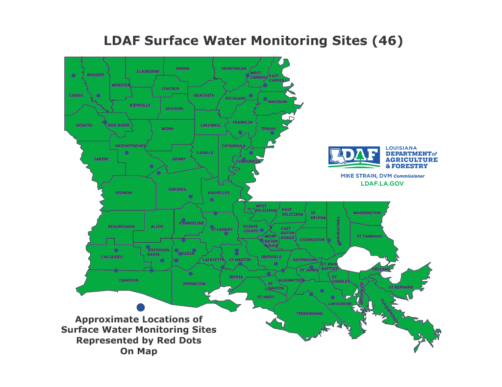 The Louisiana Department of Agriculture and Forestry is responsible for ensuring that the waters of the state are protected from pesticide contamination. In order to achieve this objective, the Department maintains a statewide monitoring network for surface and ground water and samples on a set schedule to verify that the waters are free of any level of pesticides that would cause concern. LDAF has in place 46 surface water sampling sites and 50 groundwater sites that are sampled. These sites are strategically located to monitor the areas most likely to be impacted by any agricultural pesticide usage. The site locations are shown in the maps.